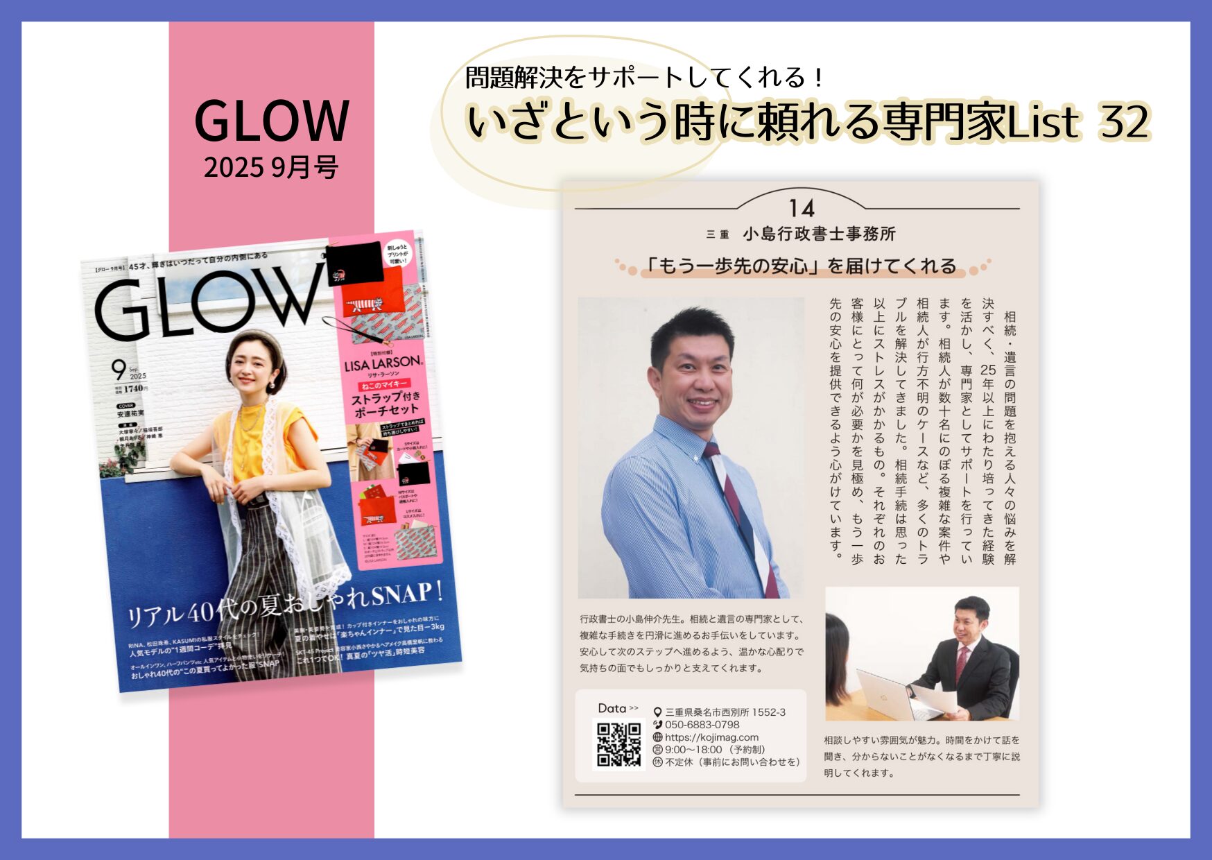 「GLOW」9月号にて、全国の「いざという時に頼れる専門家List32」の一人としてご紹介いただきました。